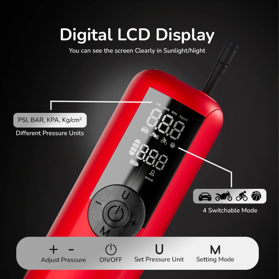 DUAL DIGITAL DISPLAY: Features a high-precision digital display showing pressure in PSI, kPa and Bar units, ensuring accurate inflation levels, enhancing safety and control for every use.