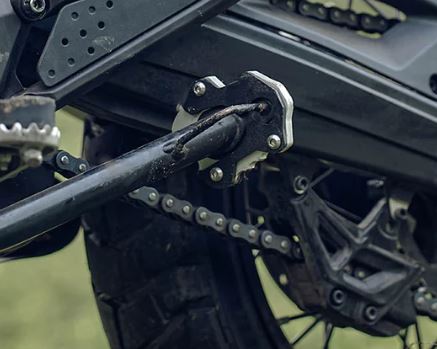 Enhance the stability of your KTM Adventure 390 (2025 model) with the Aluminium and Mild Steel Side Stand Base in a striking silver and black combination, available at Legundary Custom Built. This dual-material design features a durable mild steel lower plate for strong ground contact and a lightweight aluminium upper plate for improved corrosion resistance and aesthetics. The widened base increases the surface area of the side stand, preventing the bike from sinking into soft surfaces like sand or mud, making it an essential upgrade for touring and off-road riders. Precision-engineered for a perfect fit, this side stand base ensures reliable performance and adds a rugged yet refined touch to your motorcycle.