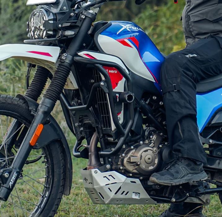 The Legundary Hero Xpulse 210 Xplorer Crash Guard for the Hero X pulse 210 available at Legundary Custom Built is designed to provide robust protection for your motorcycle during off-road adventures and daily commutes. Crafted from high-quality mild steel this crash guard is engineered to absorb and distribute impact forces, safeguarding critical components like the engine radiator and fuel tank in the event of a fall or collision. The guard features a precision engineered design that ensures a perfect fit for the Hero Xpulse210 allowing for easy installation without the need for modifications. Its powder coated finish in Black Red or White not only adds a stylish touch to your bike but also offers resistance against corrosion and wear.