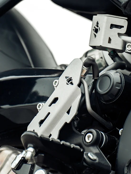 The Royal Enfield Guerrilla 450 Master Cylinder Guard is an essential accessory designed to protect your bike's master cylinder from damage during off-road adventures or everyday rides. Crafted from durable materials, this guard shields against impacts, debris, and harsh elements, ensuring long-lasting protection and performance. Its sleek design complements the Guerrilla 450's rugged look while offering a precise fit for easy installation. Ideal for riders seeking both functionality and style, the Master Cylinder Guard enhances the durability and safety of your bike, making it a must-have upgrade for any adventure enthusiast.