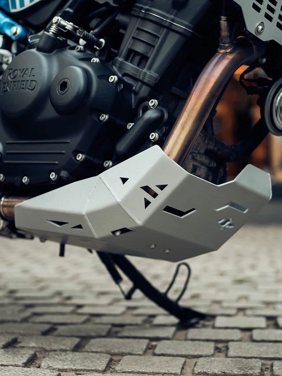 The Royal Enfield Guerrilla 450 Bashplate from Legundary Custom Built, crafted from lightweight yet durable aluminum, is the ultimate protective accessory for your motorcycle. Designed to shield the engine and lower frame from rocks, debris, and harsh impacts, this bashplate ensures maximum safety during off-road adventures. Its high-quality aluminum construction provides a perfect balance of strength and weight, enhancing maneuverability without compromising protection. With a sleek, corrosion-resistant finish, it maintains its aesthetic appeal while enduring tough conditions. Upgrade your Royal Enfield Guerrilla 450 with this premium bashplate for superior protection and a rugged look on every ride.