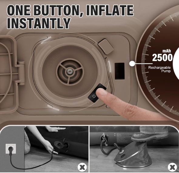 • 【Air Pump】: The mattress comes with a built-in air pump slot and a one-button dual-use pump. The pump can inflate and deflate the mattress with just one button, and it can be used as a light, with three adjustable gears.