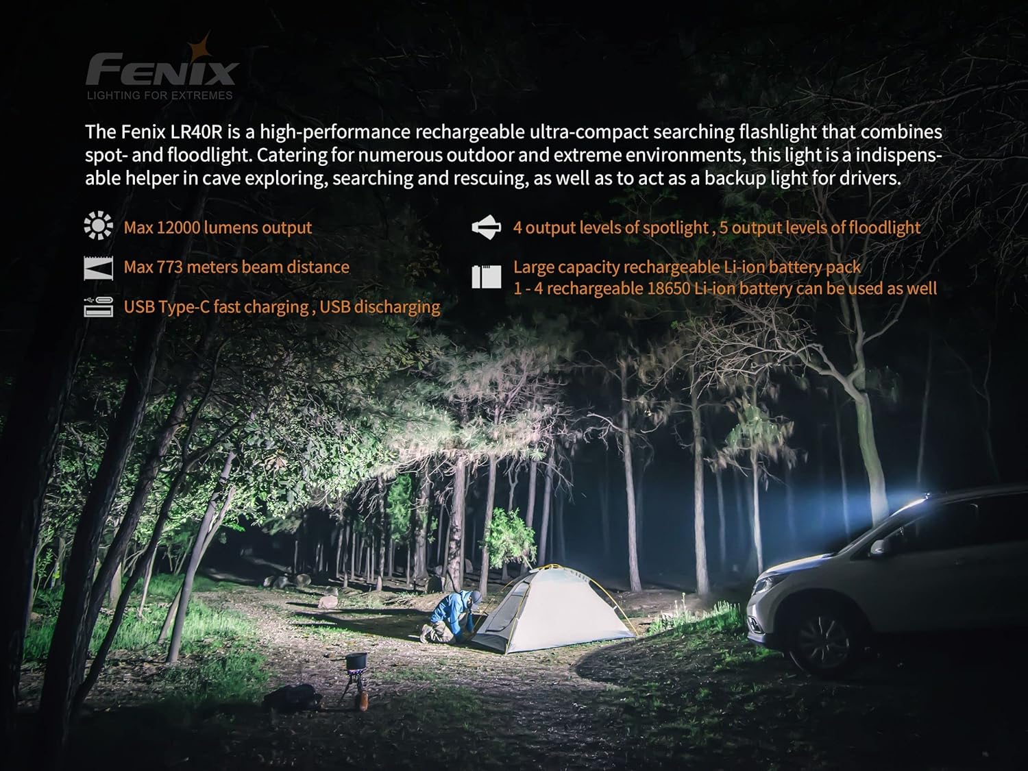 The Fenix LR40R V2 gets its power from the built-in ultra-large capacity battery pack constructed from 3 batteries of 5000mAh, allowing you to reach 177 hours ultra-long runtime from a full charge. The flashlight has a built-in intelligent sensing circuit which means that when the light head is close to an illuminated object, the flashlight will automatically downshift the brightness level with a sensing distance is withing 60mm. This feature can prevent danger caused by high temperatures. This lightweight flashlight features up to 25 hours runtime in Eco mode and with the built-in Type-C Charging port, the battery can be fully charged for an approximately 4 hours from a depleted state. It has also an accurate and reliable battery status through the LED read-out indicators.