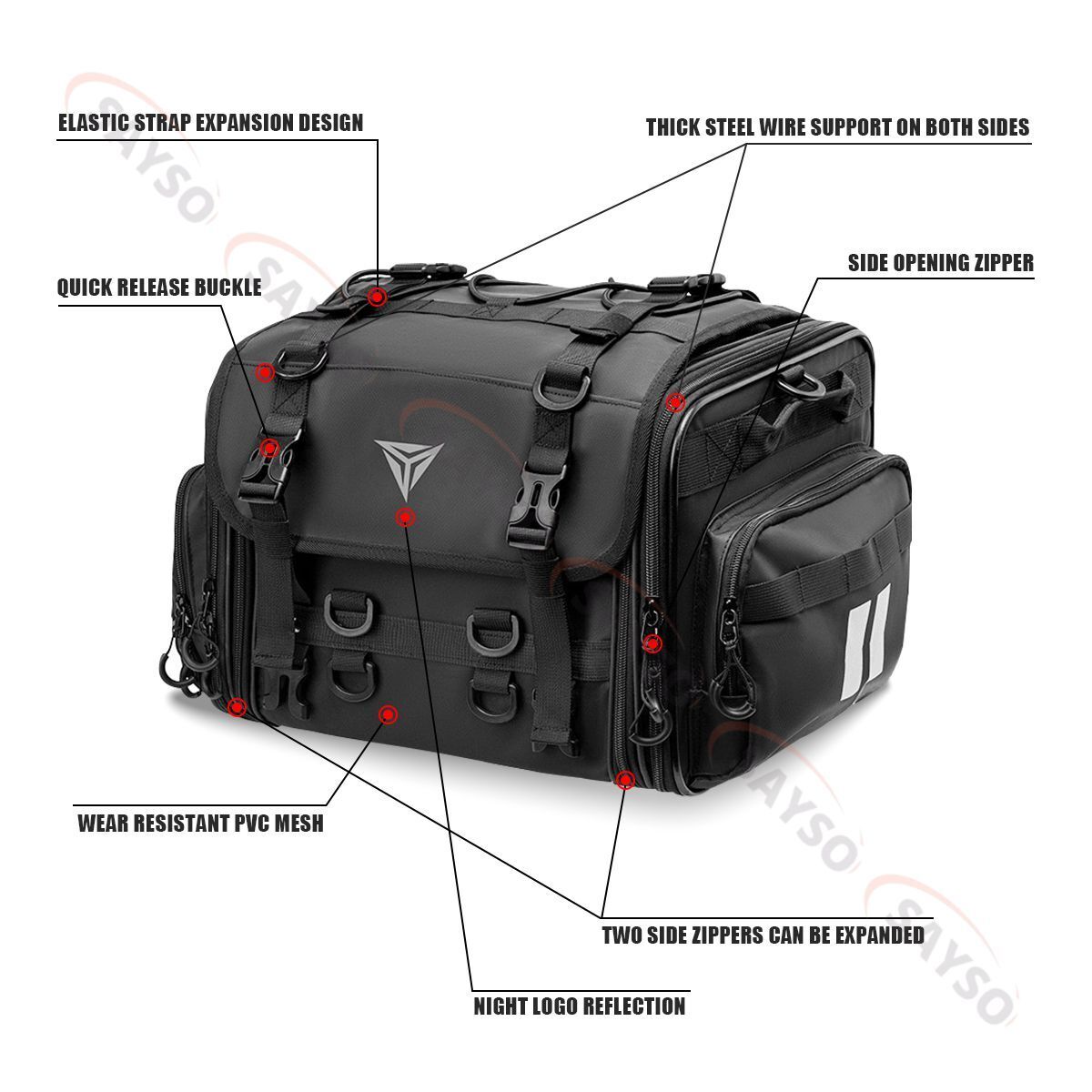 Meet the Claw Pro Tail Bag, tailored for today's adventurers. Its sleek design and sturdy build epitomize the ideal blend of style and utility. Perfectly suited for sports tourers, it boasts two convenient side pockets for quick access to your essential touring gear. Inside, the large main compartment, which can be sub-divided into 3, keeps your belongings neatly organized when the need arises. The inner seam sealed WP liners and the external raincover shield your gear from rain and harsh weather. Crafted from tough fabric and imported Duraflex fittings, and with a generous 60-liter capacity, the Claw Pro is your go-to partner for epic long-distance journeys.