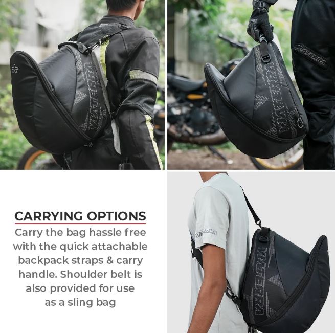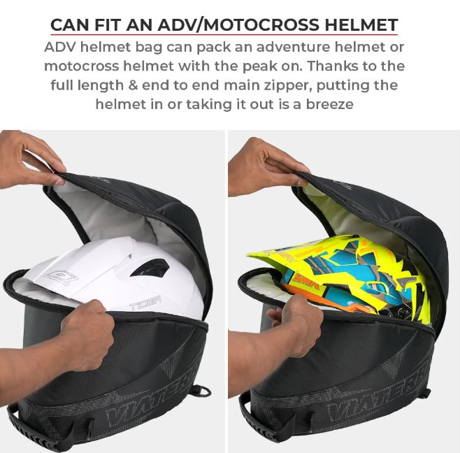 The ViaTerra ADV Helmet bag is designed to safeguard your helmet from bumps, scratches, and dust during everyday handling or storage at home, helping to extend its lifespan. Compatible with all ADV/motocross helmets, even with the peak on, this bag offers versatile carrying options with backpack straps, a shoulder belt, and a carry handle. Its airport-friendly design makes transportation easy. The bottom zipper allows convenient access to the helmet cavity, which can also be used as a storage pocket for gloves, a balaclava, a wallet, and other small essentials.