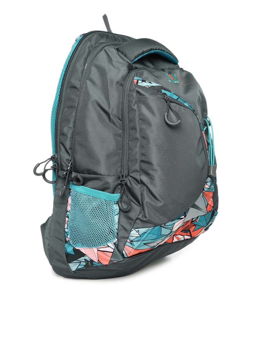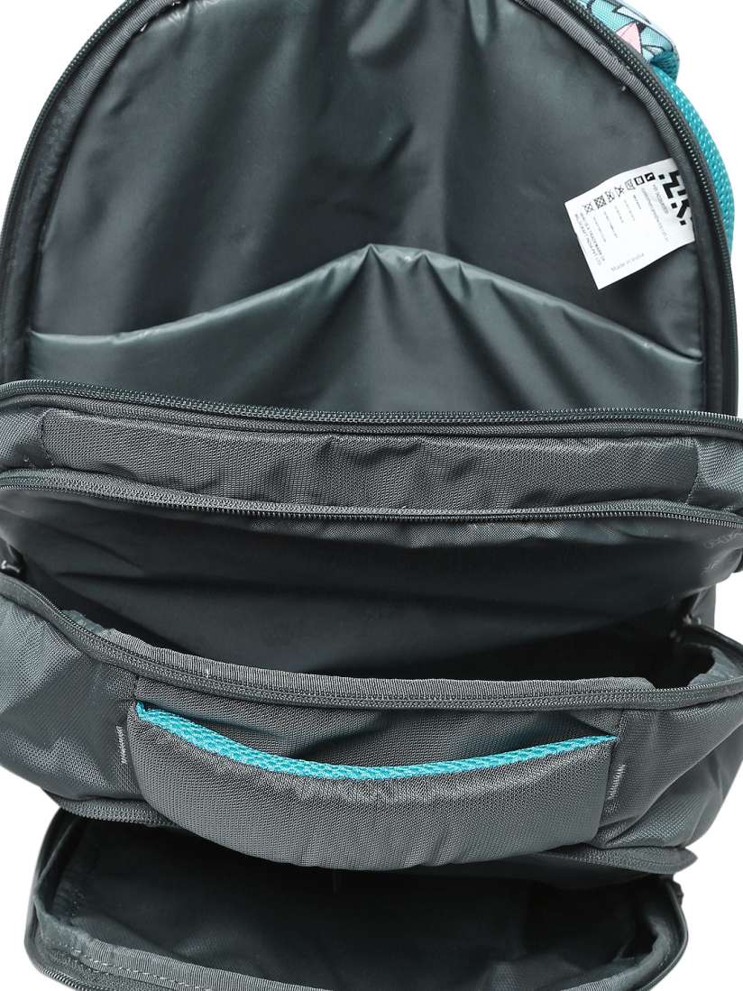 Grey textured backpack with multicoloured accents, has printed and stitched details, embroidered branding and an elasticated toggle closure on the front