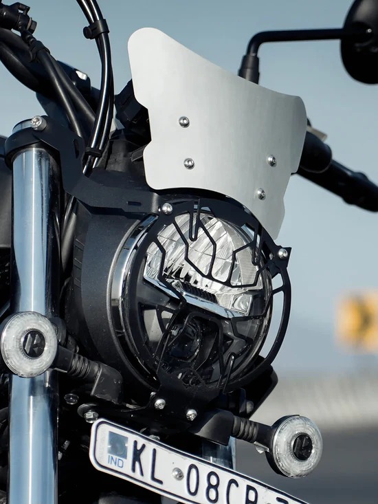 The Legundary Hero Mavrick 440 Mig Headlight Grill available at Legundary is a premium accessory designed to provide robust protection and a rugged look to your motorcycle headlight. Made from durable materials, this grill acts as a shield against debris, stones, and other potential hazards, ensuring the longevity and clarity of your headlight. The grill is designed to fit seamlessly onto various bike models, offering both an aesthetic upgrade and functional safety enhancement. Its stylish yet practical design not only complements the overall appearance of the bike but also provides an additional layer of defense during off-road adventures or everyday rides. The Legundary Hero Mavrick 440 Mig Headlight Grill is an essential accessory for any rider looking to enhance their motorcycle's durability and style.