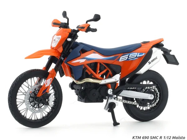 Experience the thrill of the KTM 690 SMC R with this detailed 1:12 scale model. Renowned for its dynamic performance and bold styling, this model accurately captures the striking orange, blue, and white colour scheme of the original bike, making it a standout addition to any collection.