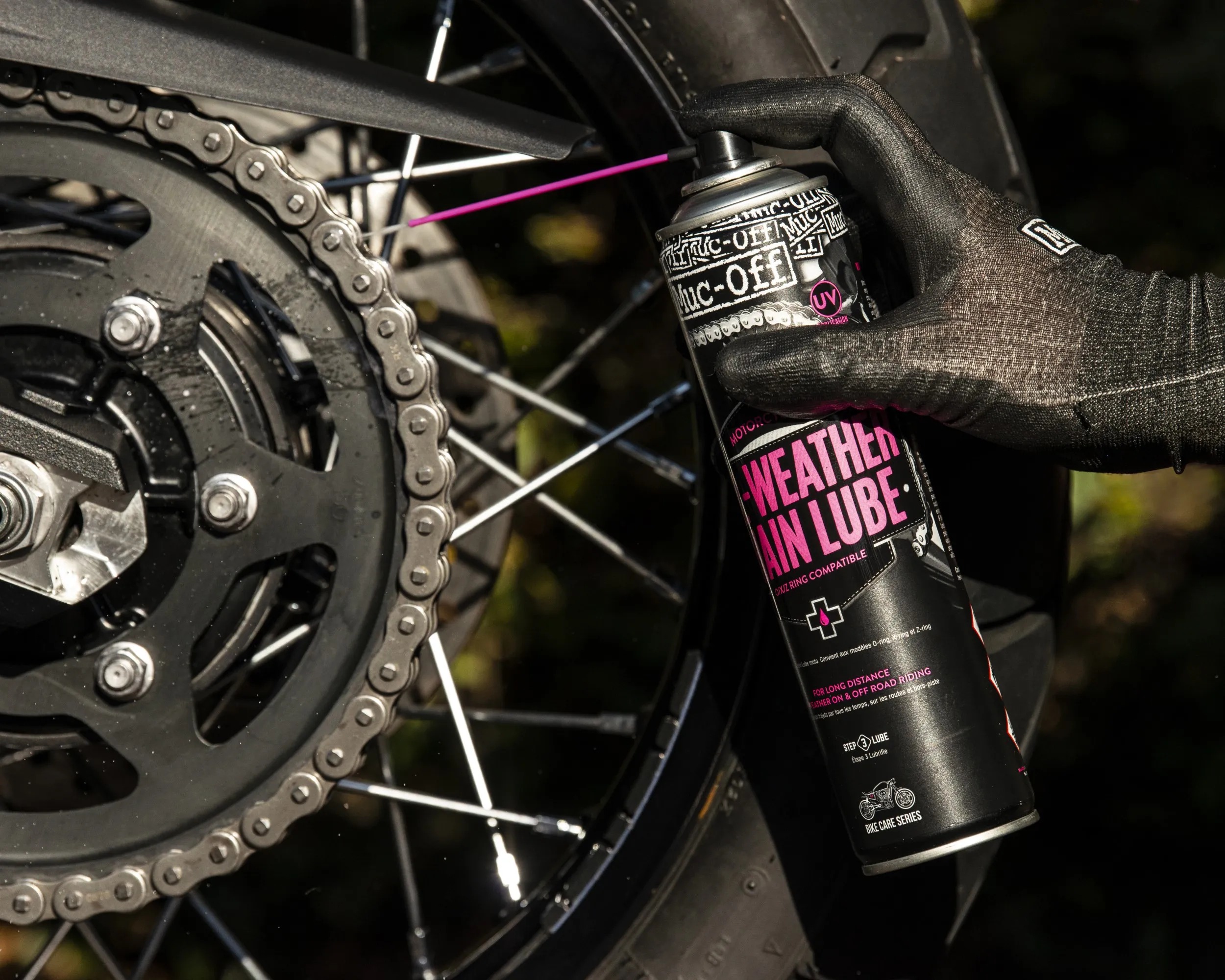 After years of research and development, Muc-Off identified that there were some big differences with what riders want and need from a chain lubricant. After all, racing motorcycles, touring motorcycles and off-road machines are all going to have different chain lube requirements. Muc-Off All-Weather Chain Lube is the first of its kind and is set to revolutionize chain efficiency and performance for all motorcycles covering longer distances and is ideal for tourers or commuters as you can go far longer between reapplication intervals.