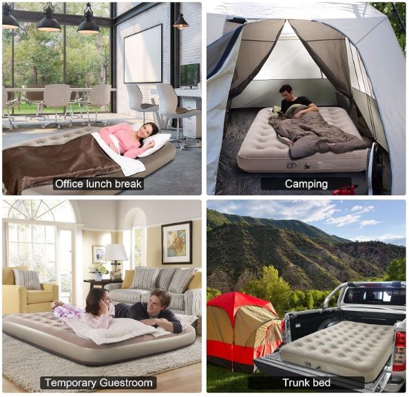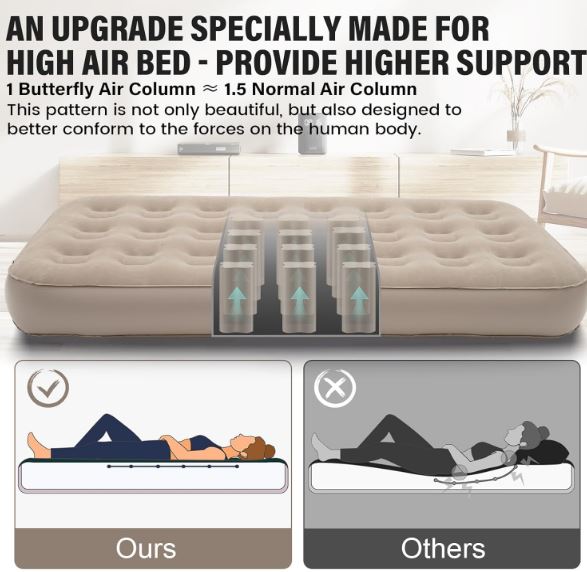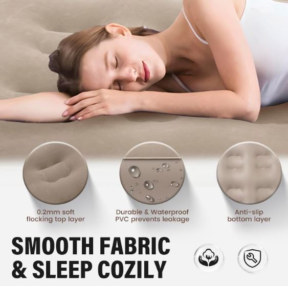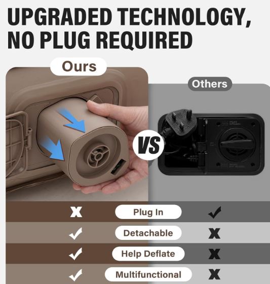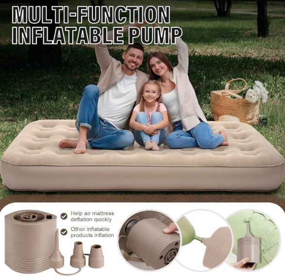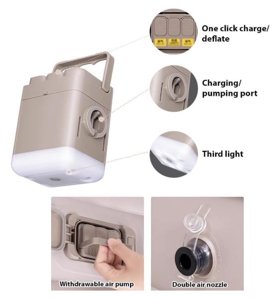 • 【Air Pump】: The mattress comes with a built-in air pump slot and a one-button dual-use pump. The pump can inflate and deflate the mattress with just one button, and it can be used as a light, with three adjustable gears.