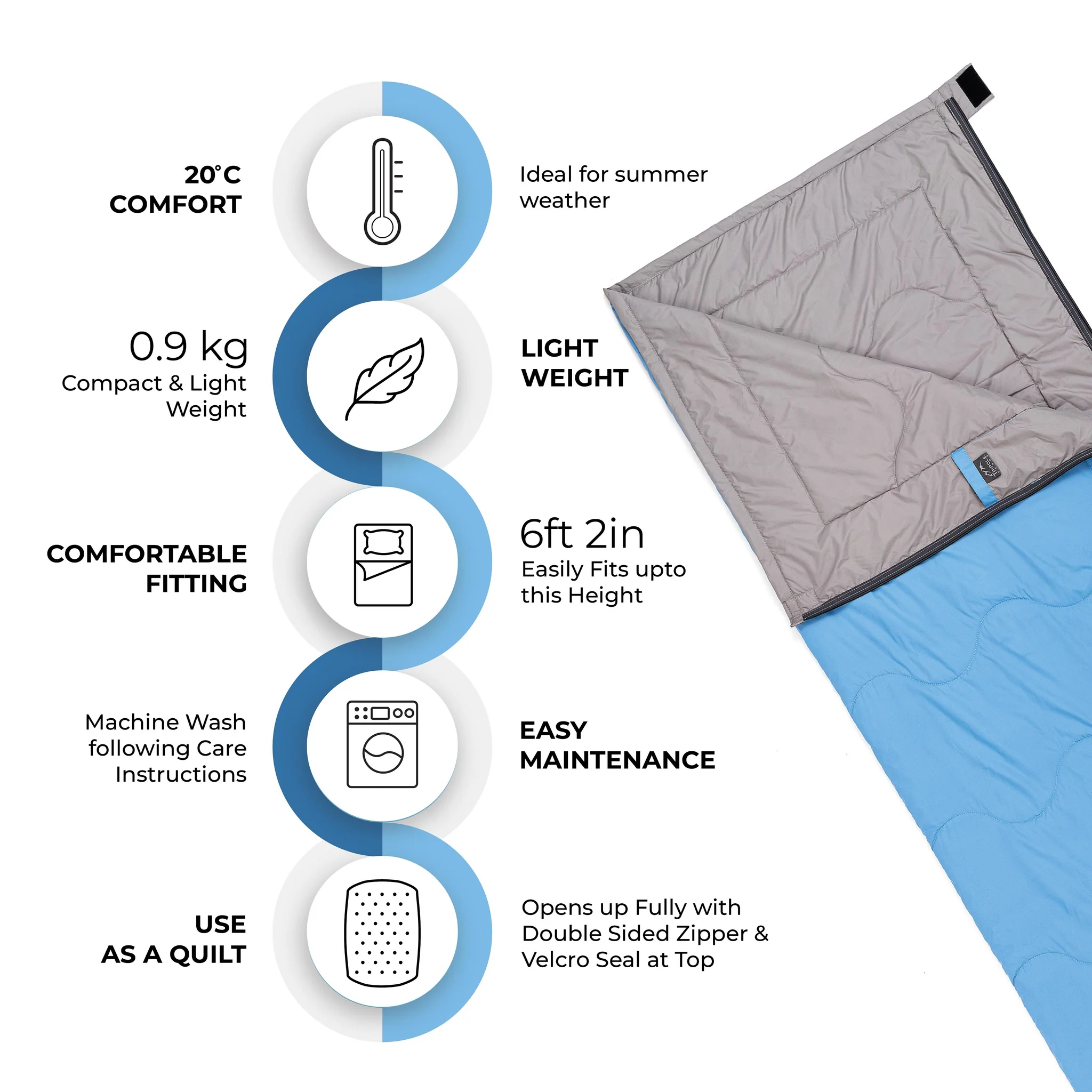 The Camp Series Envelope sleeping bag has been machine quilted with a unique design on water-repellent durable fabric. Compact packing makes it ideal for trekking and miltary personnel where it can be adjusted inside any luggage bag. This has been tested in temperatures upto 20 degree celcius which means that this is ideal for summer weather.