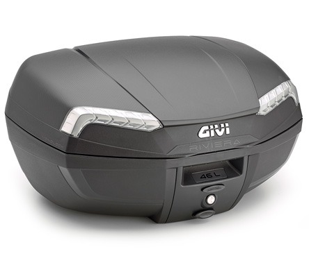The GIVI E46 RIVIERA Top Case offers a soft removable mat as standard, affixed with hook and loop fastening to the base, and can load two helmets, also modular versions (of average size, like the GIVI X.21).