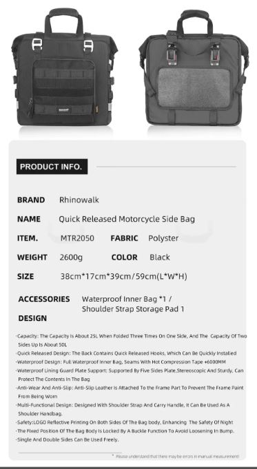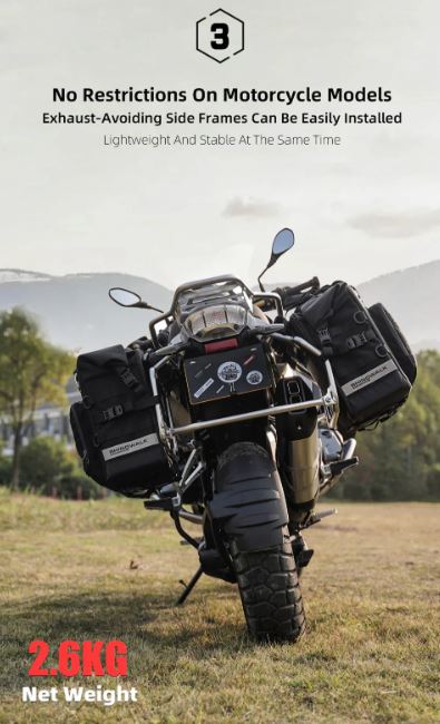 Simple Installation: The back of the bag contains a quick release tool for quick installation. It is generally used in motorcycles on the market, and can be installed with or without an exhaust pipe. Provide multiple sizes of gaskets, suitable for side frames with a pipe diameter of 10mm-23mm. The fixed position is locked with a buckle function to avoid loosening during bumpy riding.