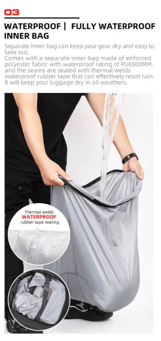 Large Storage Space: The normal use capacity of the main bag is about 23L, and can be expanded to 35L. When fully expanded, it can fit a full-face helmet easily and worry-free with lockable zipper.