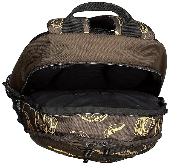 A double compartment backpack with a side mesh pocket, front pocket, organizer, cushioned padded back, static shoulder straps.