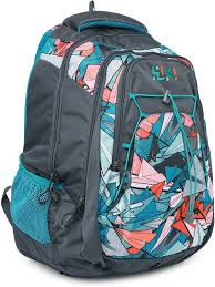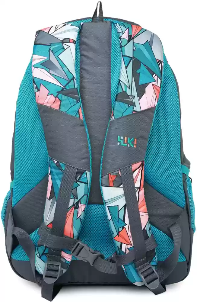 Grey textured backpack with multicoloured accents, has printed and stitched details, embroidered branding and an elasticated toggle closure on the front
